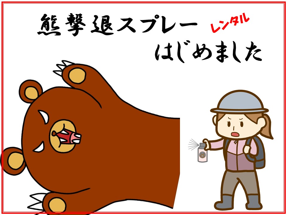 今年は酸ヶ湯周辺での熊の目撃情報はありませんが、もしものための備えは大切です。レンタル料金は12,500円(税込、内保証金10,000円)で、未使用で返却していただければ保証金10,000円を返金いたします。レンタルを希望する方は酸ヶ湯温泉売店へお立ち寄りください。